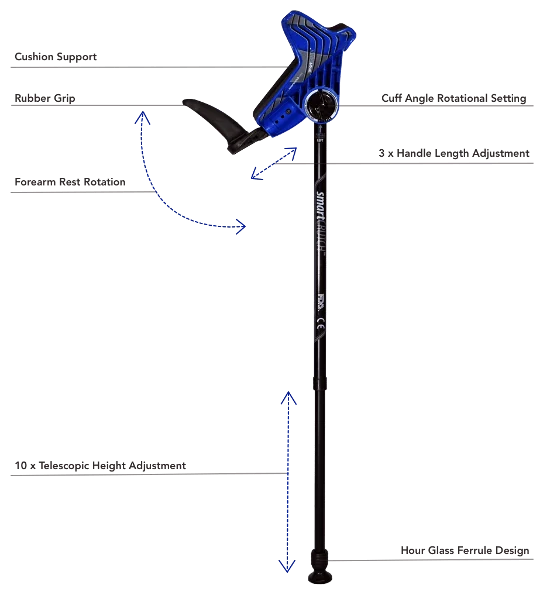 Only weighing 990 grams per crutch. Ergonomically designed grips to suit the natural wrist and hand positions in a neutral state; Left and Right hand. Adjustable forearm brace, allows individual setting to suite ones own comfort requirements.